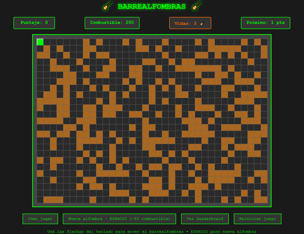 El tablero es una alfombra. La idea es que pases por las casillas sucias (las grises) para limpiarlas, cuidando de recorrer la mayor cantidad posible de esas casillas sin caer en ninguna casilla limpia. Cuantas más sucias seguidas pises, más puntos. Muchos más. Tanto que ni vale la pena recorrer unas pocas: hay que apuntar a muchas decenas por vez, y preferiblemente a más de cien. En cualquier momento, apretando la barra de espacio conseguís una alfombra nueva (es decir, con la mugre intacta), a costa de gastar 50 de combustible. El combustible es un problema: si se acaba, perdés una vida.
