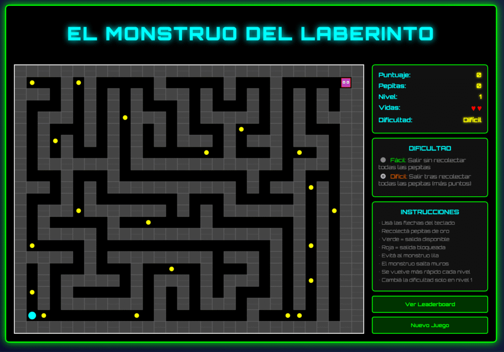 Acá va el primero de esos juegos: El monstruo del laberinto. Tenés que recorrer el laberinto (diferente cada vez) juntando pepitas de oro, mientras un monstruo te persigue. ¿Podrás juntar más puntos que yo?
