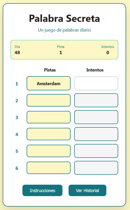 Hice este juego de palabras para jugar online. El objetivo es descubrr la palabra secreta usando las pistas. Las pistas pueden ser anagramas, rimas, y sobre todo conceptos, objetos o ideas relacionadas. Cada día, una palabra nueva.